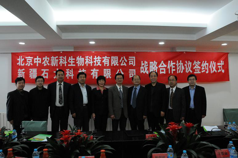 2011年11月7日上午9点半,北京中农新科生物科技有限公司与新疆石大科技有限公司战略合作项目签约仪式在中国农科院农业资源与农业区划研究所2楼会议厅隆重举行。合作双方拟在新疆库尔勒国家级经济开发区建设集新型生物肥料、种子生物包衣、菌种研发与应用、产品开发生产于一体的农业科技产业园。